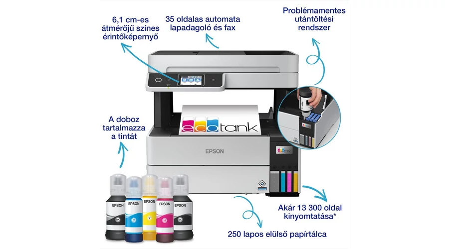 ISO: 13,8 lap/perc mono, 8,9 lap/perc színes; vázlat: 37 lap/perc mono, 23 lap/perc színes *Nyomtatási felbontás: 4.800 x 1.200 dpi *Terhelhetőség: 1.600 oldal/hó *Tinták: No.112 (mind PIGMENT), Maintenance Box: T04D1 *Nyomtatás PC-ről, MAC-ről, mobileszközökről *Szkennelés felbontása: 1.200 dpi x 2.400 dpi *Kiadvány-formátum: BMP, JPEG, PICT, TIFF, multi-TIFF-be, PDF, PNG *Fekete-fehér és színes faxolás *Csatlakozók: Wi-Fi Direct, Vezeték nélküli LAN, IEEE 802.11b/g/n (WiFi 4), Nagy sebességű USB - USB 2.0 specifikációval kompatibilis, Ethernet-csatoló (100 Base-TX / 10 Base-T) *Papírformátumok: 9 x 13 cm, 10 x 15 cm, 13 x 18 cm, 13 x 20 cm, 20 x 25 cm, 100 x 148 mm, 16:9, No. 10 (boríték), C6 (Boríték), B5, A6 (10,5x14,8 cm), A4 (21.0x29,7 cm), A5 (14,8x21,0 cm), Felhasználó által definiált, B6, C4 (Boríték), Letter, Legal, DL (boríték) *Automatikus dokumentum-behúzás: 35 lap *Használható papírsúly: 64 - 300g/m2 *Automatikus kétoldalas nyomtatás (DUPLEX) *Papírtálca kapacitás: 250 lap, kiadó tálca: 30 lap *Mobil és felhőalapú nyomtatási szolgáltatások: Epson Connect (iPrint, Email Print, Remote Print Driver, Scan-to-Cloud), Apple AirPrint *LCD kijelző: színes, érintőképernyős, 6,1 cm átlójú *Emulációk: PCL3, PCL5c, PCL5e, PCL6, PostScript 3, PDF 1.7 *A doboz tartalma: 1 szett tinta (1 x 127 ml BK, 3 x 70 ml cmY) + extra fekete, Készülék, Tápkábel, Beállítási utasítás, Garancia dokumentum *Mellékelt palack(ok) kapacitása: fekete-fehér 13.300 oldal, színes: 5.200 oldal *Garancia: 12 hónap vagy 100.000 oldal; bevivős/beküldős